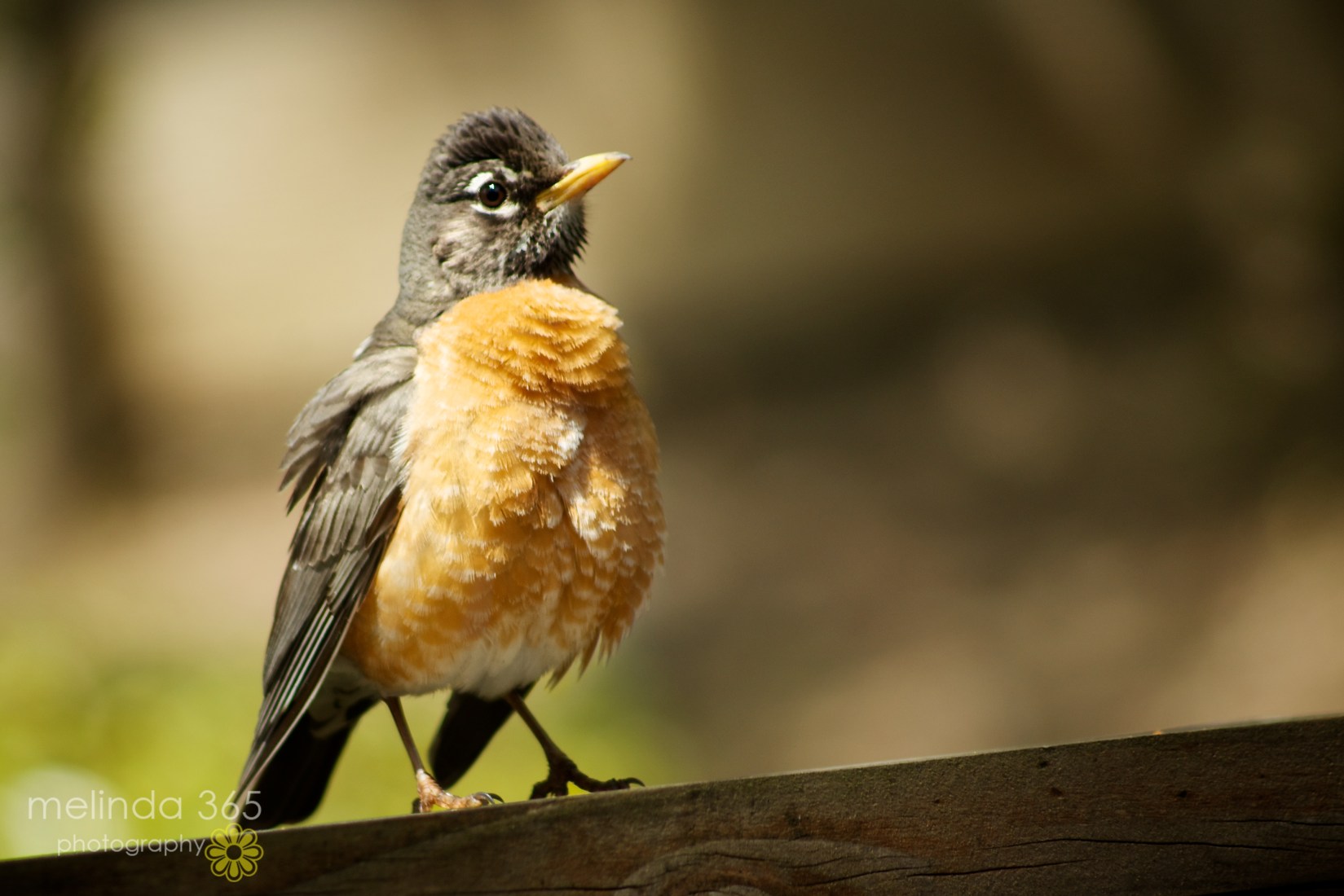 I watched the scrub jays poking around in the dirt and then a woodpecker(?) in the neighbors pine tree. Suddenly a robin landed ten feet in front of me- and the jay swooped down to chase him away. I gave up my idea of being artsy and went inside to get my longest lens (70-300mm) in case there was any more interesting bird action. I had one of my custom user settings set up for just such occurrences (aperture priority, continuous autofocus, auto ISO). Today I changed that custom setting from auto ISO to ISO 200, because I really do not like the lack of control using auto ISO. I was playing around in manual, taking flower photos, when all of a sudden, the robin returned, landing on the deck railing. I quickly switched to my custom setting and captured some quick photos as he looked around.