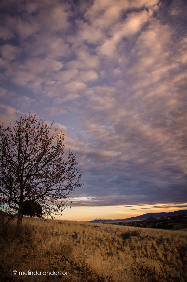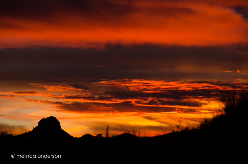 The iconic Thumb Butte, visible almost everywhere in Prescott, was the subject for last night’s sunset shots. Although you can see it almost everywhere you go, I had no idea until a few months ago that you could see it from our yard. Granted, you have to stand in a small corner and lean over a bit to get a good look (or stand hunched over in the bathtub, and peek out the window through the branches of a tree . . .), but we DO have a view!