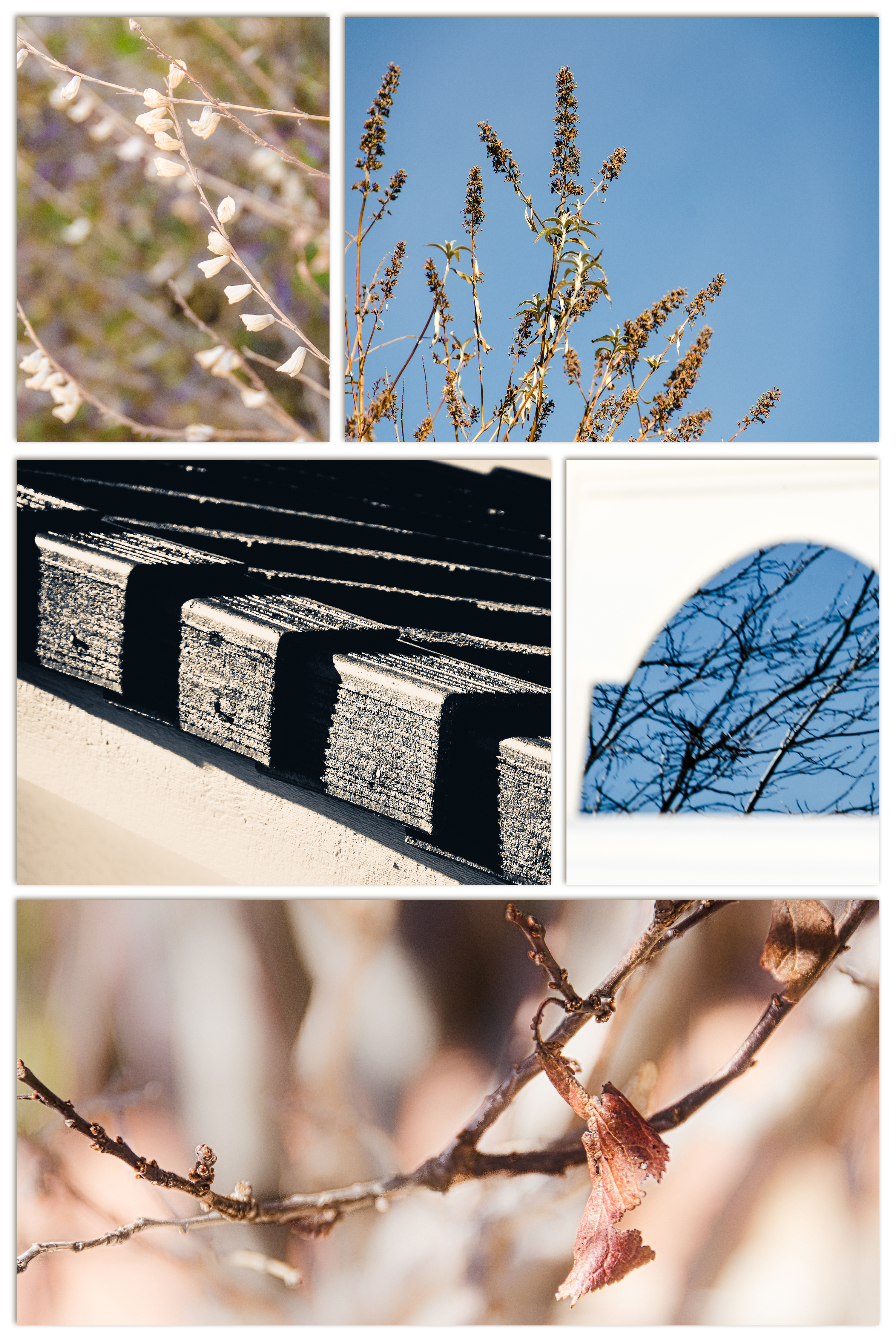 So that’s the good news! I’ve been in kind of a photo rut lately. This happens periodically, and I have learned to just go look for the light. But the light in our house isn’t terrific, and the outside light has been either harsh or flat (on the one cloudy day we had recently). The landscape is pretty brown and bare- and it just hasn’t been calling to me. Excuses, excuses! So today I just decided to embrace the harsh light and walk around outside with my camera. I used one of Kim’s storyboards to create a collage in Photoshop. Yes, I even took photos of my garage windows and roof. . .