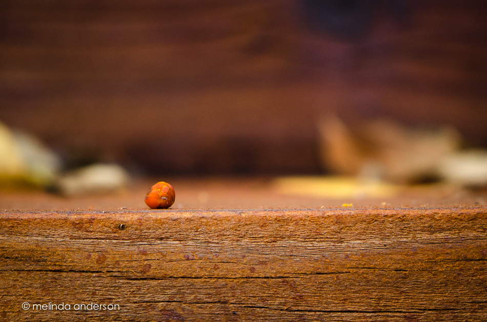 Our deck has just been stained, and I wanted to capture its new look. Of course it is already littered with leaves, which make a natural subject for my macro lens. This photo was so hard for me to frame using the rule of thirds- maybe one of the other rules of composition (triangle, golden ratio, golden spiral?) applies…
