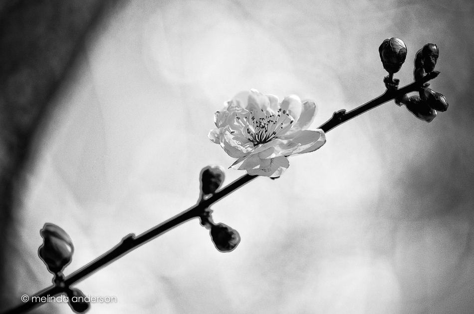 Last Friday, I photographed this blossom- one of the few on my flowering plum that day. Today the tree is covered with blossoms.