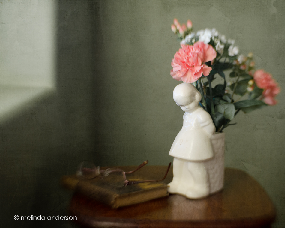 Mastering the combination of appropriate aperture, manual focus, and correct tilt of the Lensbaby has been a challenge to say the least. To create this still life, I had some seemingly simple goals. I wanted window light, soft focus on the window and edges of the photo, and, most importantly, the face of the little girl figurine/vase to be in focus. It was the last goal that was, of course, the most difficult. Out of the 31 photos I snapped, two had good focus on the face. This actually represents improvement to me!