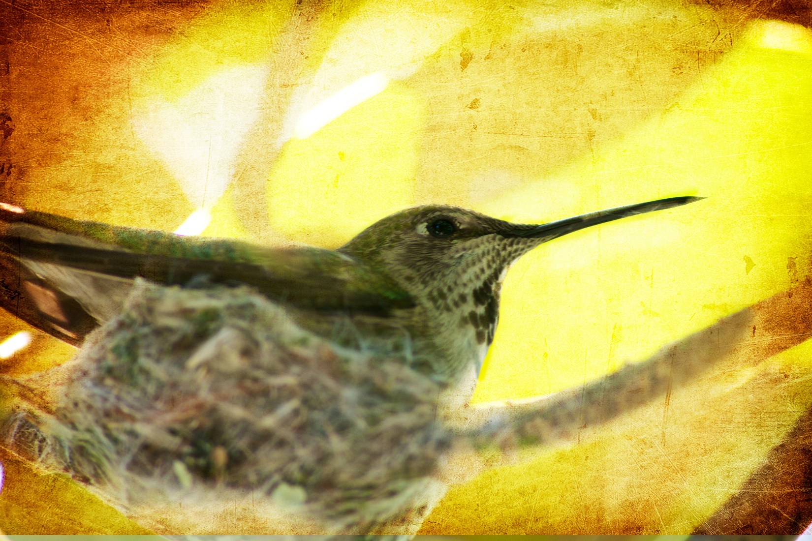 After I had already posted my Monday photo of the day, my son-in-law, Justin, discovered a mama hummingbird sitting on her nest in our magnolia tree which hangs over our deck. Using my zoom lens, I stood underneath and snapped a zillion photos. I was happy with this image and had a lot of fun processing it with Kim Klassen’s warm sun texture.