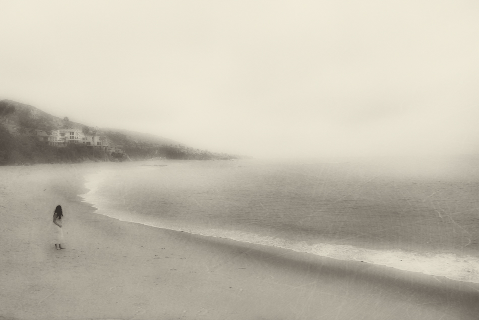 When we were walking along the beach at Laguna, we came upon what I think was an engagement shoot. The young woman remained on the beach as the photographer headed past our group for the next set up. I took the opportunity to take a few shots thinking I could use them for some sort of image. I ended up lengthening her dress and moving her arms (she was cold and had her arms loosely folded across her chest) to make a more pleasing image. I’m not sure what she was looking back at, but I am thinking this has potential as the cover of a romantic mystery! 😉