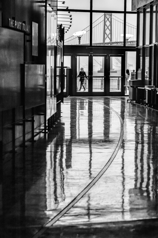 I’m not sure this qualifies as street photography, because I was standing in the entrance of a building in San Francisco (with my photography buddy, Carol) shooting through the gorgeous lobby and focusing on the Bay Bridge through the windows at the end. It was Carol’s idea to wait for someone in red to come by to make the shot- and she did! I am happy to say that there was no cropping or cloning- just a little work on exposure and then a black and white conversion. The garbage cans (always a no-no) remain for journalistic integrity!