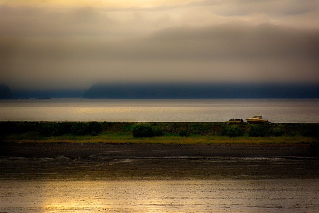 Our first day and a half in Homer, Alaska were rainy. The surrounding peaks were mostly invisible behind clouds. But at the end of our first full day, the rain had mostly stopped and light was peeking through the clouds.