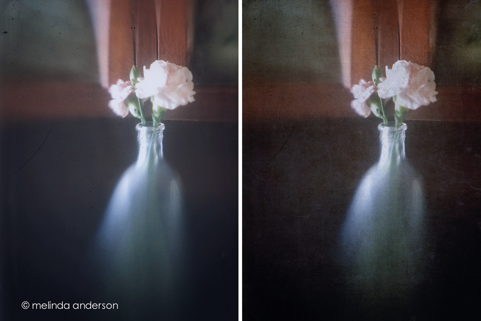 The photo on the left has been edited with Snapseed only, and the one on the right has several Kim Klassen textures added in Photoshop on top of what was done with the retrolux filter. It’s hard to spot the differences- just a little more texture, a little less haze and a slightly darker flower.