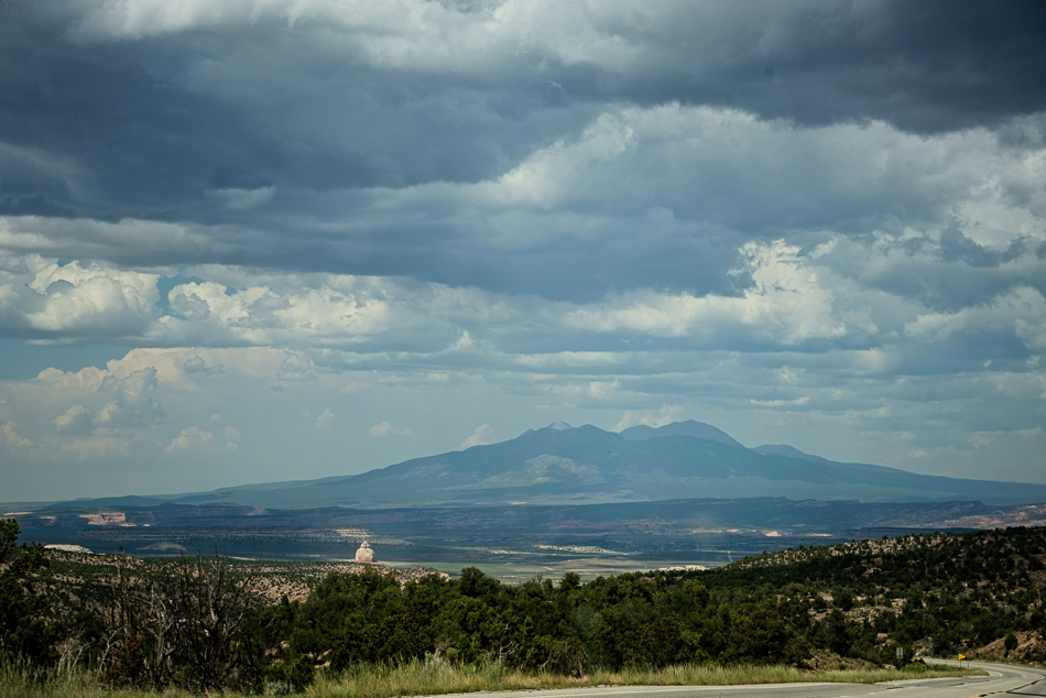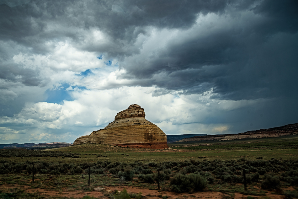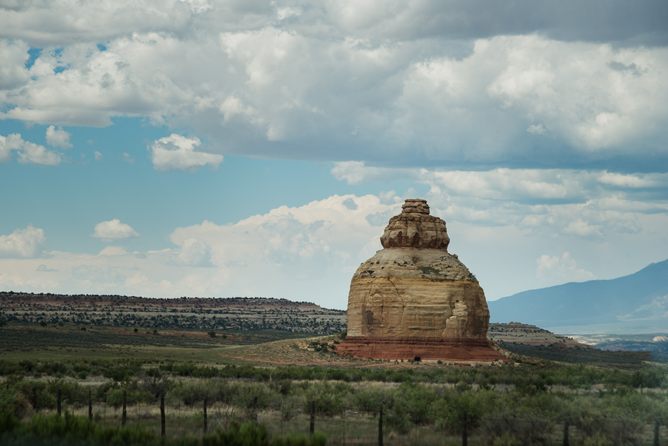 We took a few days to visit southern Utah to meet up with family a few weeks ago- what a beautiful road trip! As we drove along south of Moab we noticed what appeared to be a huge rock Buddha in the distance. The sky was darkening as rain clouds formed ahead, but the “Buddha” sat in a patch of light. I took several shots through the windshield before it disappeared from view.