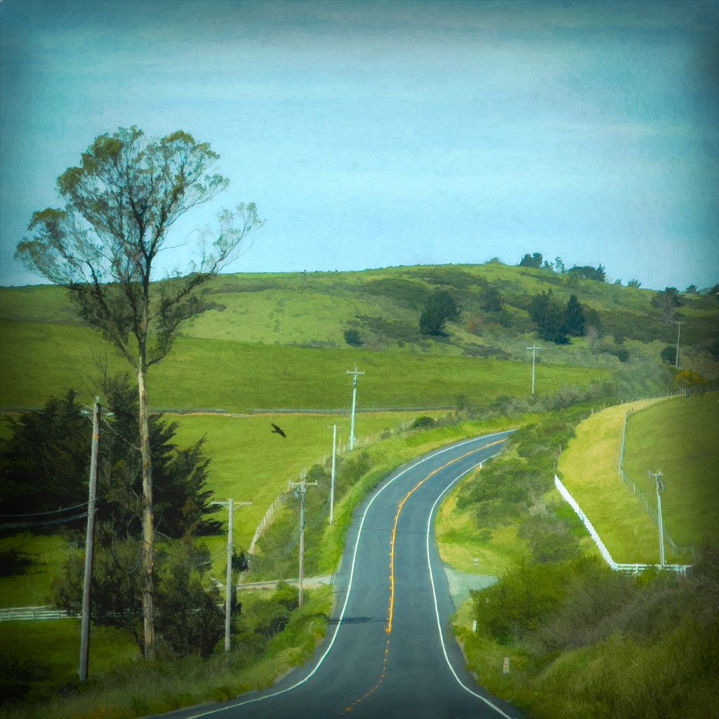 One of our favorite (and almost NECESSARY) things to do when we go back to the Bay Area is to drive over to Bodega Bay, the scene of many memories from our dating and early marriage days. The drive from Petaluma is through rural Sonoma County, and it still looks much like it did over 50 years ago. I loved this view of the curve in the road, the white power poles, and the intense green as we approached a hill and made Lonnie slow down so I could take an iPhone shot through the windshield.