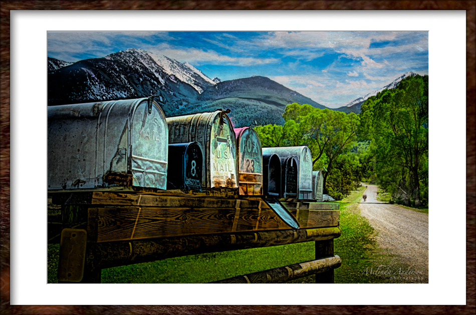 This is a re-edit of a photo from 2014. I have such clear memories of that drive through Paradise Valley in Montana with Lonnie and our grandson, Miles. It was such a beautiful day, and five year old Miles was totally involved in spotting old barns and picturesque country scenes for me to photograph. In this reimagining, I aged the mailboxes to make the image match how I was seeing them that day. I remember noticing the cows coming along as I snapped the photo, but didn’t stay to see if they stopped or turned off before they came to the road.