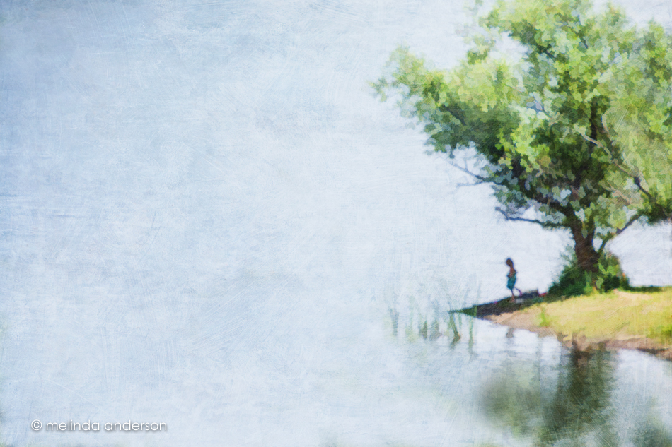 When we were walking at the lake a week ago, I was captivated by the green of this tree, which contrasted with the darker trees bordering the lake. It was hard to photograph because I could only see it through branches- so I didn’t. But I saw it again on our way back- with a little girl under it- and knew I had to try. I was already envisioning it as a painterly image. I took the resulting photo into Lightroom and then Photoshop for some cloning work. Then, I used Topaz Simplify to remove details and give it a bit of a watercolor look. I blended it with the original image, bringing back some detail- and finished it off with some textures. Playing with images is part of what keeps stress out of my life- and it’s so much fun!